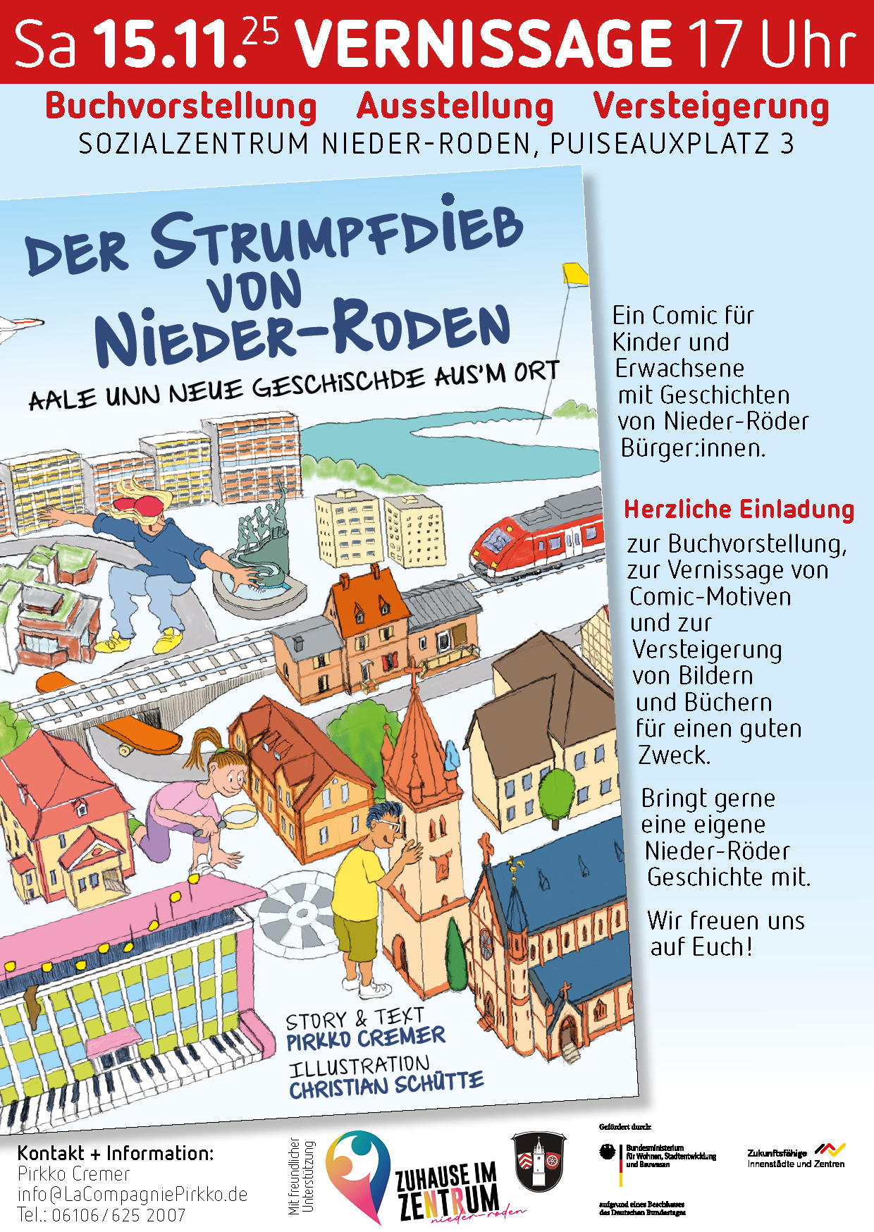 Mit der Buchvorstellung wird auch eine begleitende Ausstellung mit Comic-Motiven im Sozialzentrum eröffnet. Dabei werden Bilder und Bücher versteigert für einen guten Zweck.