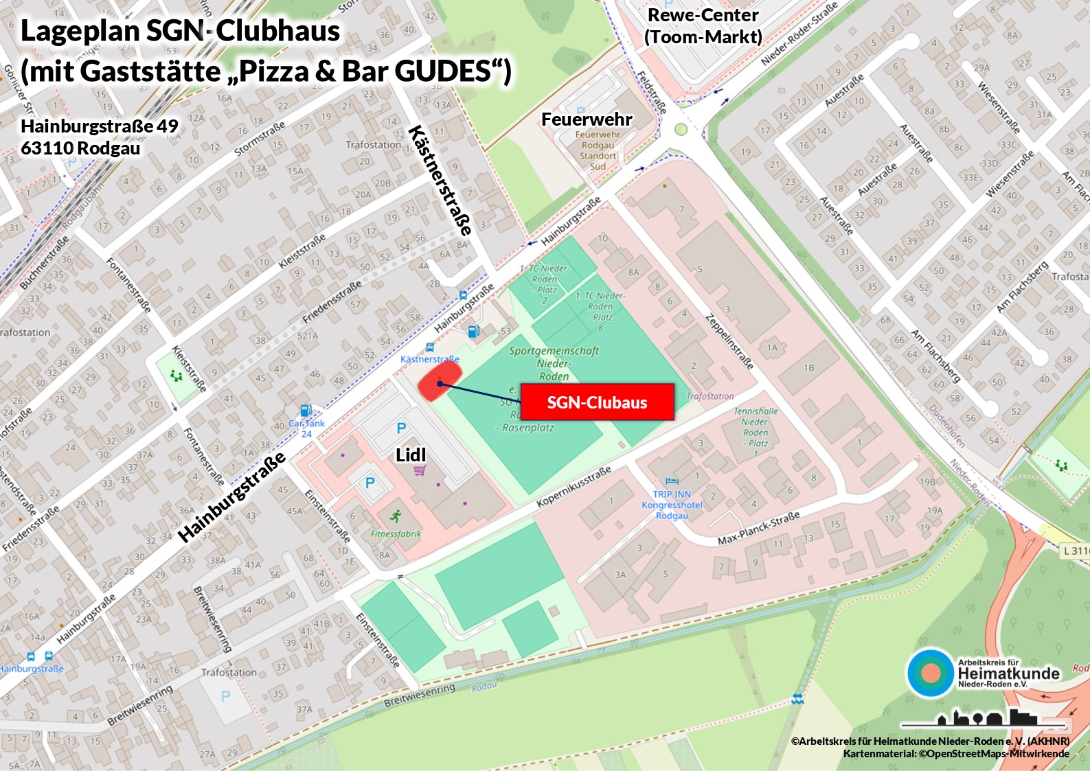 Das Treffen findet statt im Clubhaus der SGN (Sportgemeinschaft Nieder-Roden e. V. ), in der Gaststätte „Pizza & Bar Gudes“, Hainburgstraße 49, 63110 Rodgau.